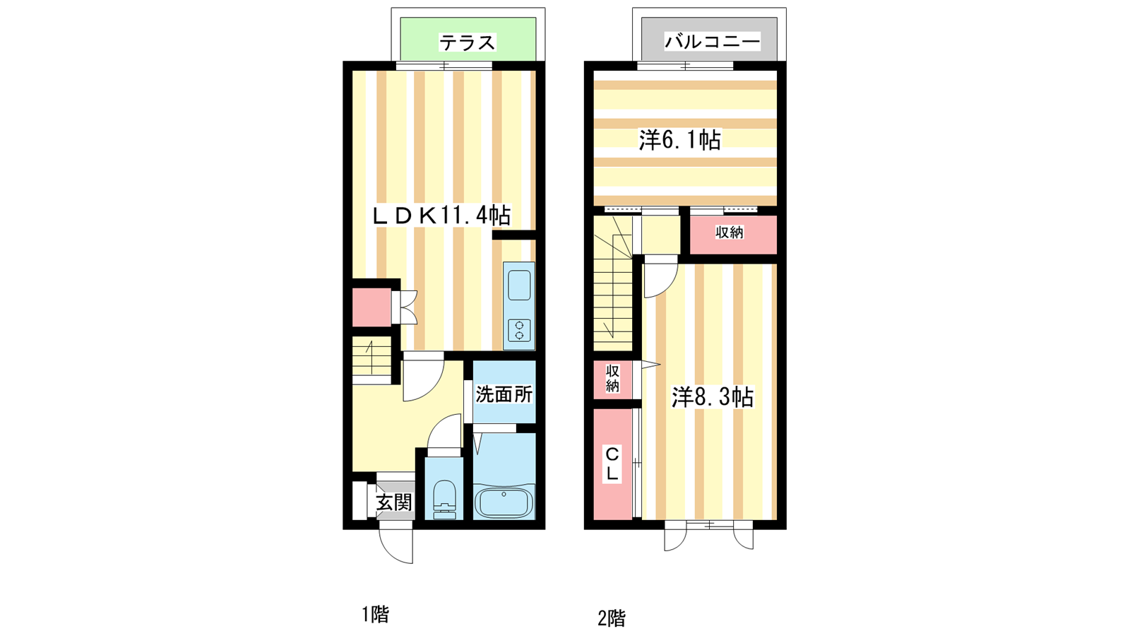 - LDK11.4帖、洋室8.3帖、洋室6.1帖