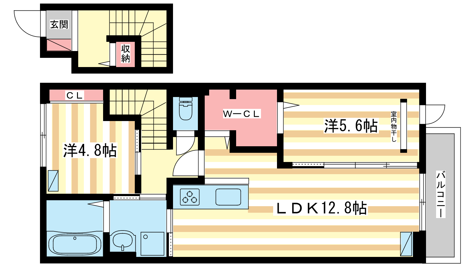 - LDK12.8帖、洋室5.6帖、洋室4.8帖
