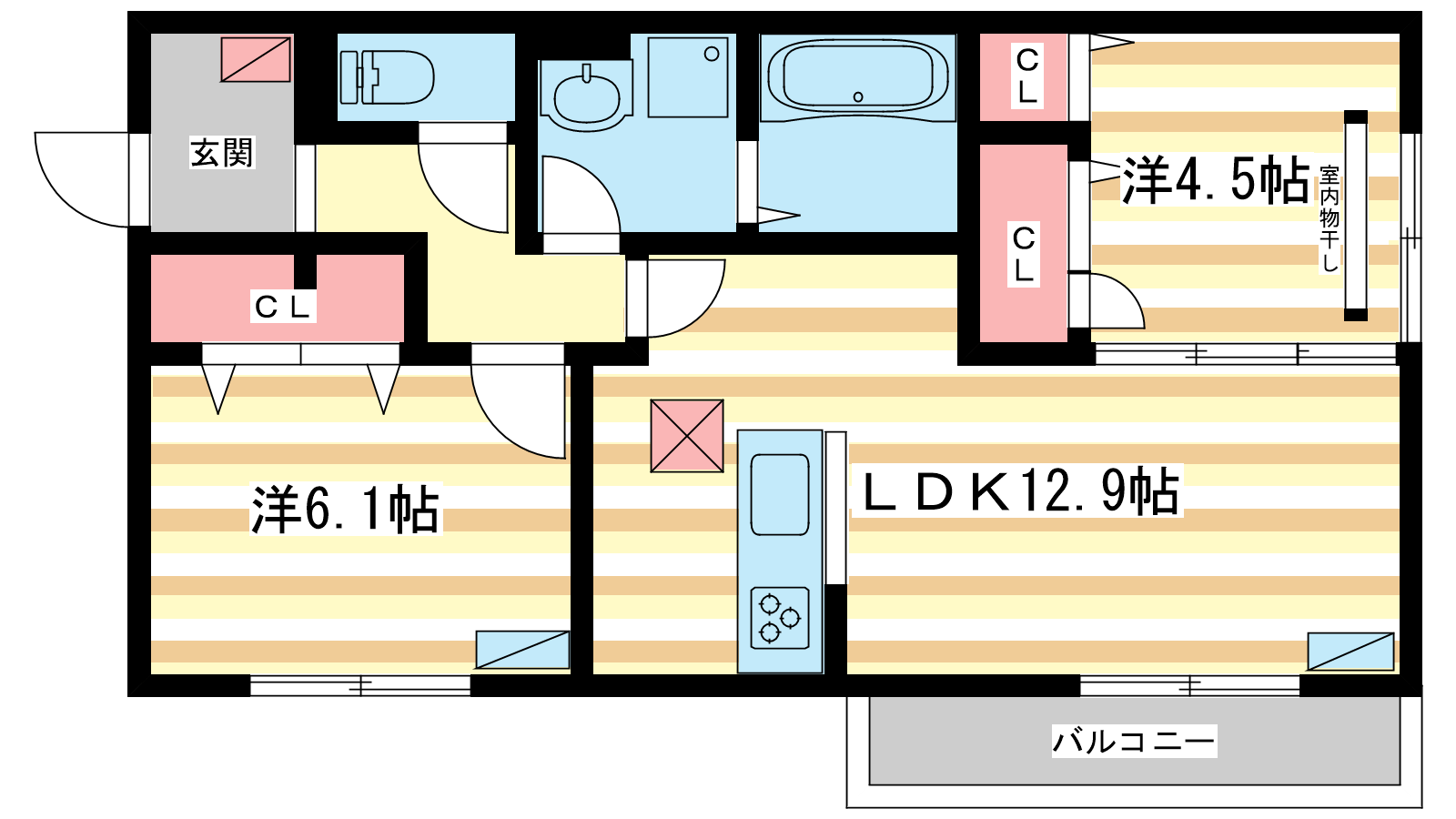 - LDK12.9帖、洋室6.1帖、洋室4.5帖