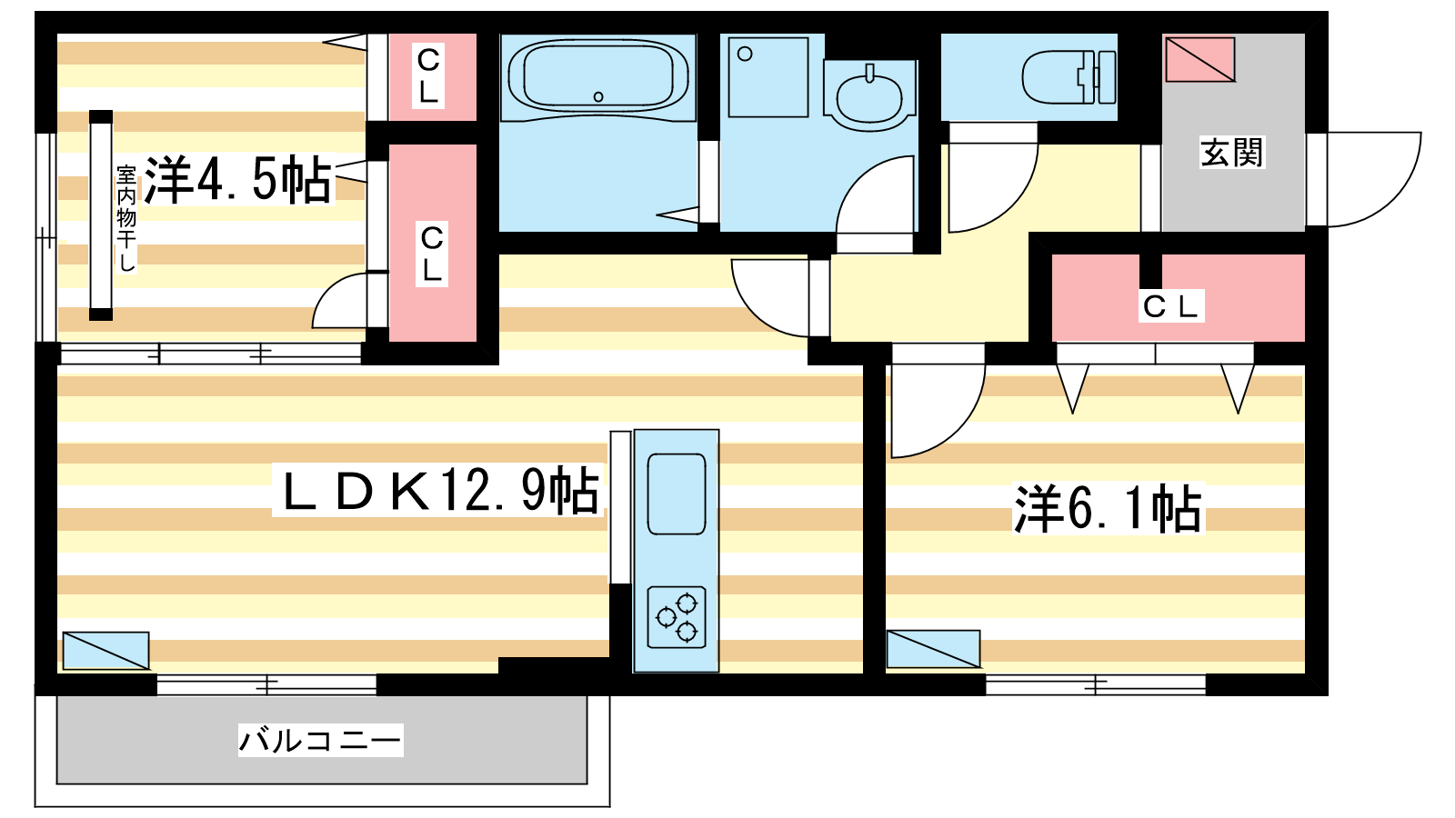 - LDK12.9帖、洋室6.1帖、洋室4.5帖