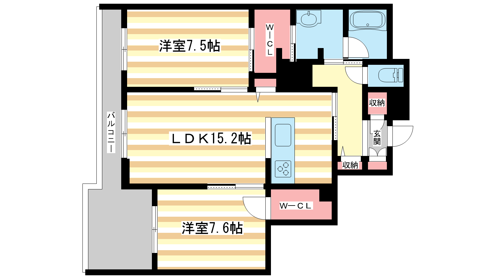 - LDK15.2帖、洋室7.6帖、洋室7.5帖