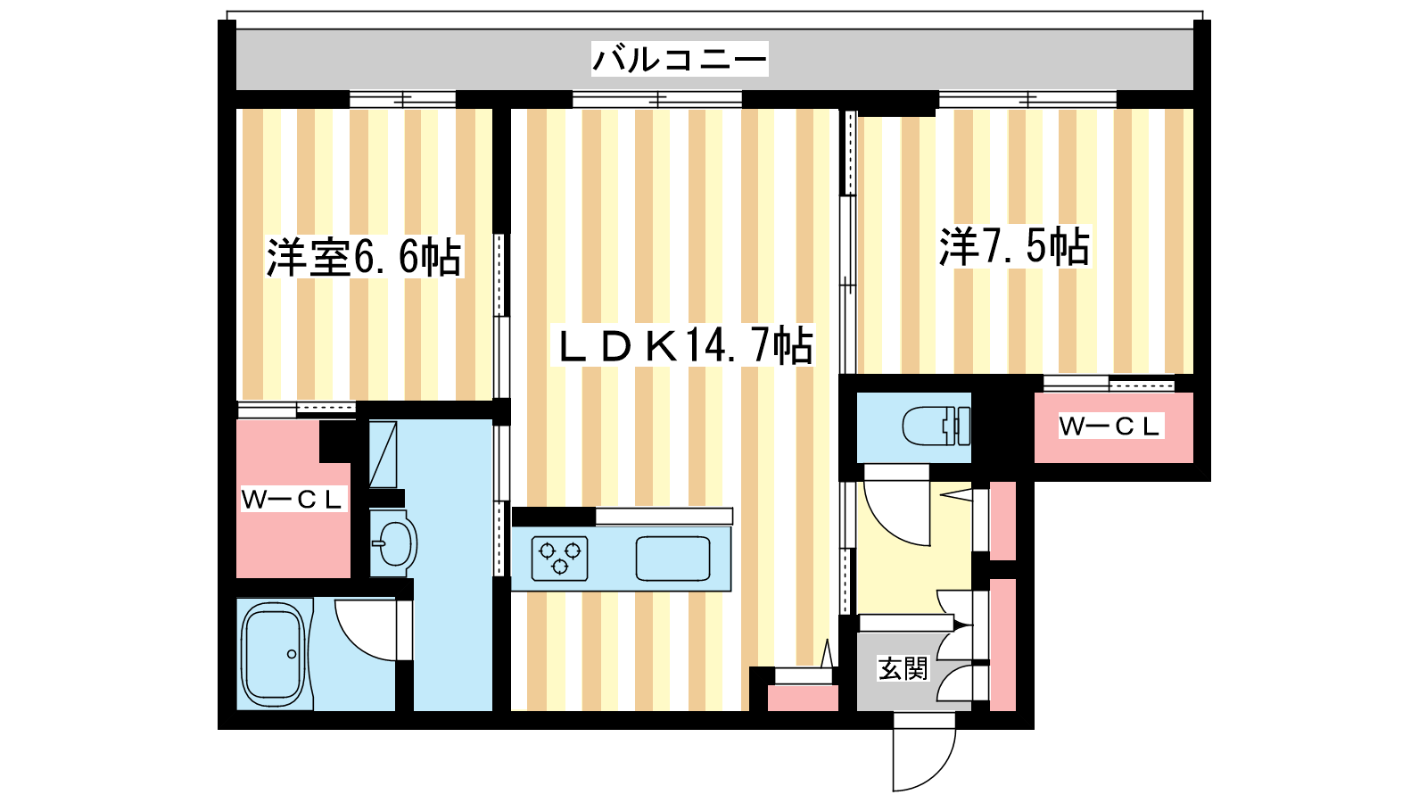 - LDK14.7帖、洋室7.5帖、洋室6.6帖