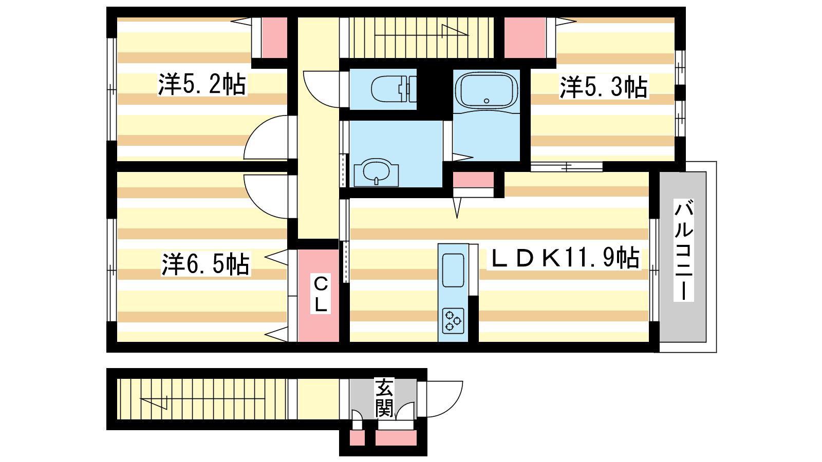 - LDK11.9帖、洋室6.5帖、洋室5.3帖、洋室5.2帖