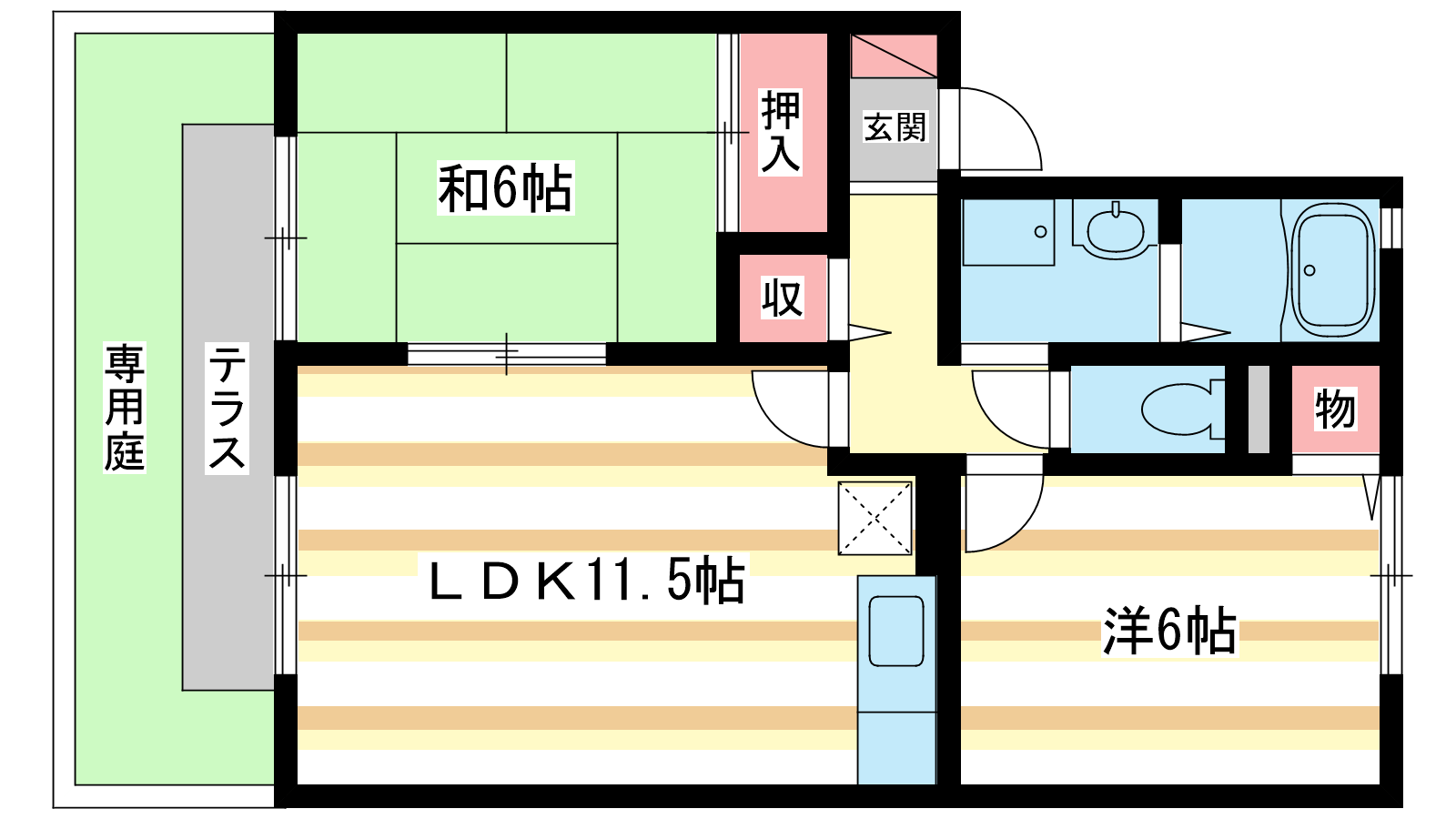 - 洋室6帖、和室6帖、LDK11.5帖