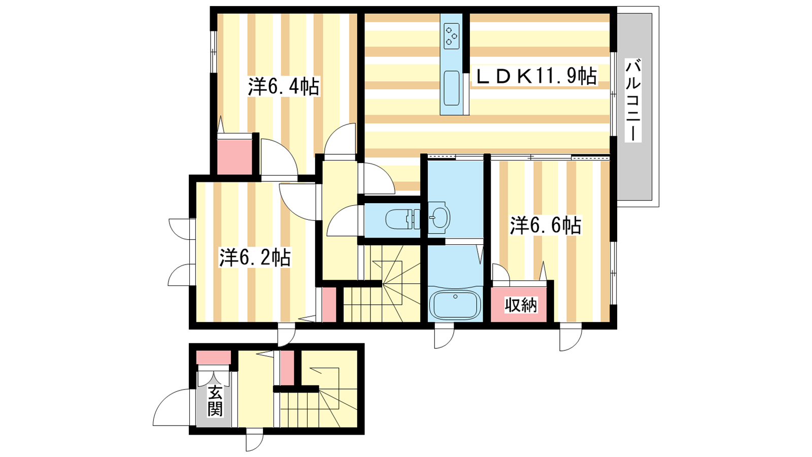 - LDK12.1帖、洋室6.6帖、洋室6.4帖、洋室6.2帖