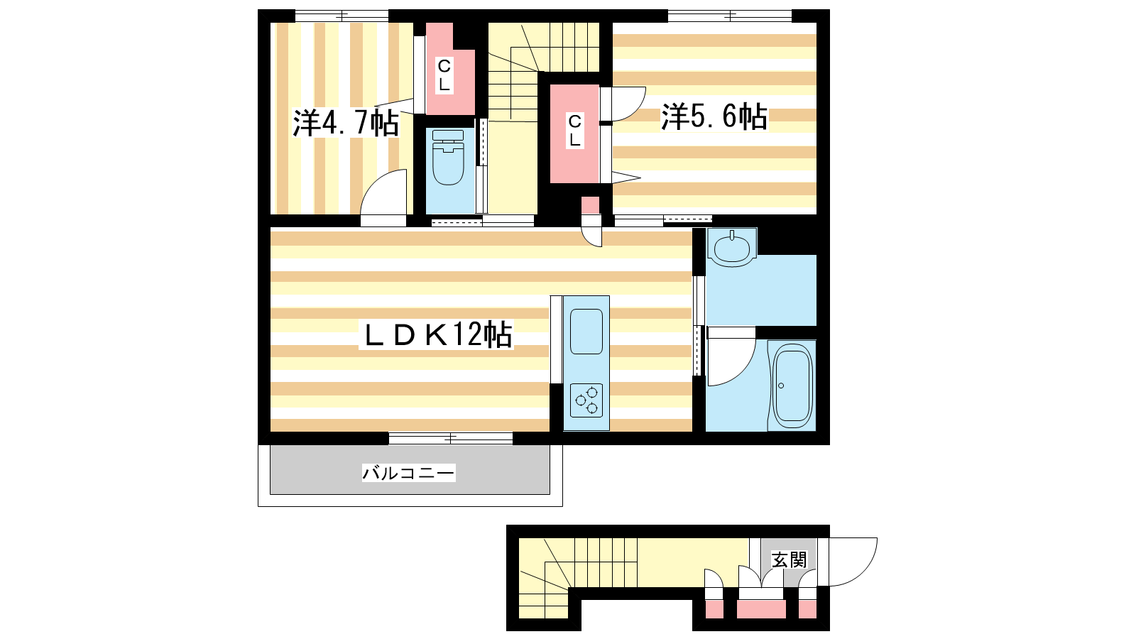 - LDK12帖、洋室5.6帖、洋室4.7帖