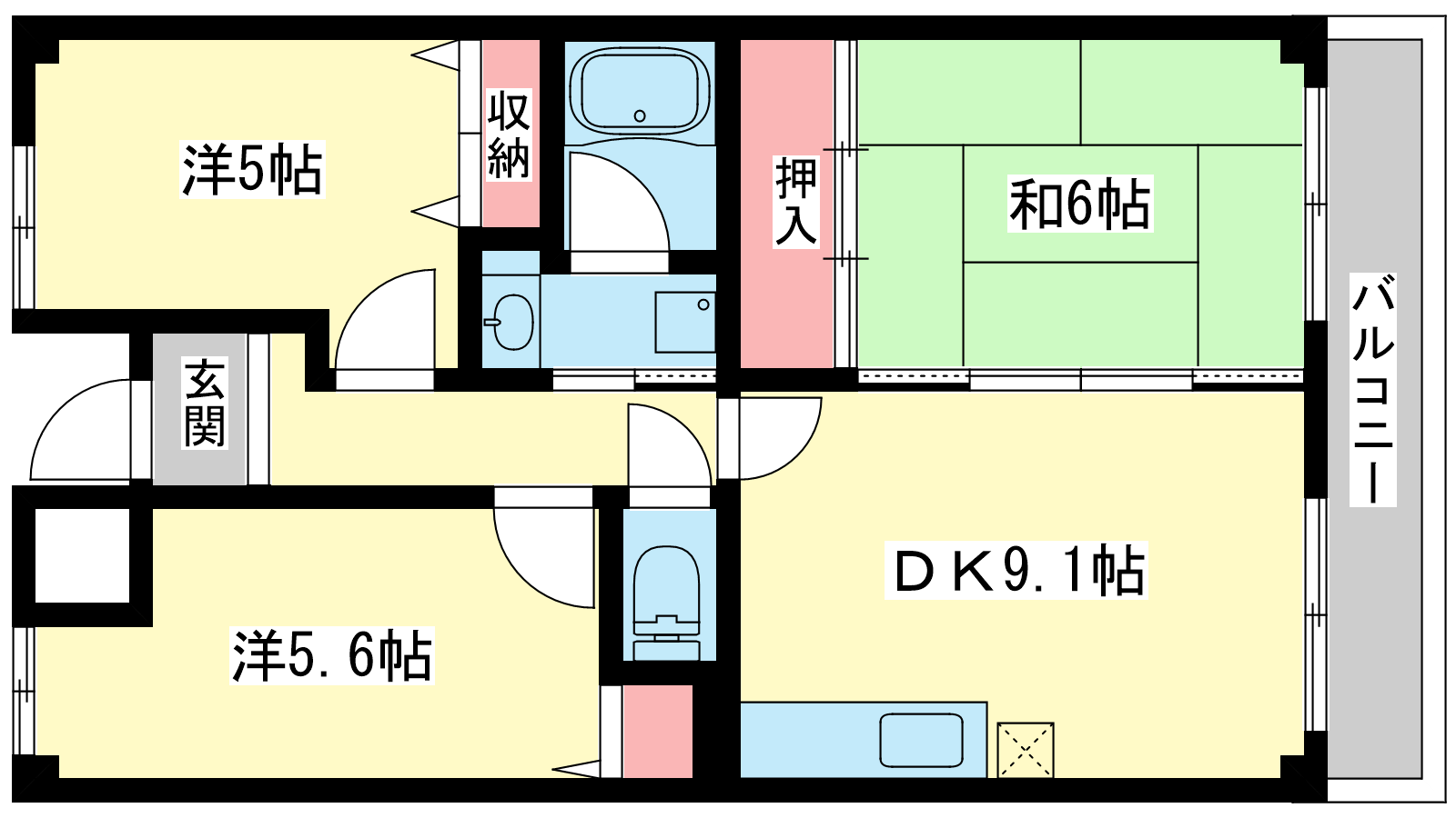 - DK9.1帖、和室6帖、洋室5.6帖、洋室5帖