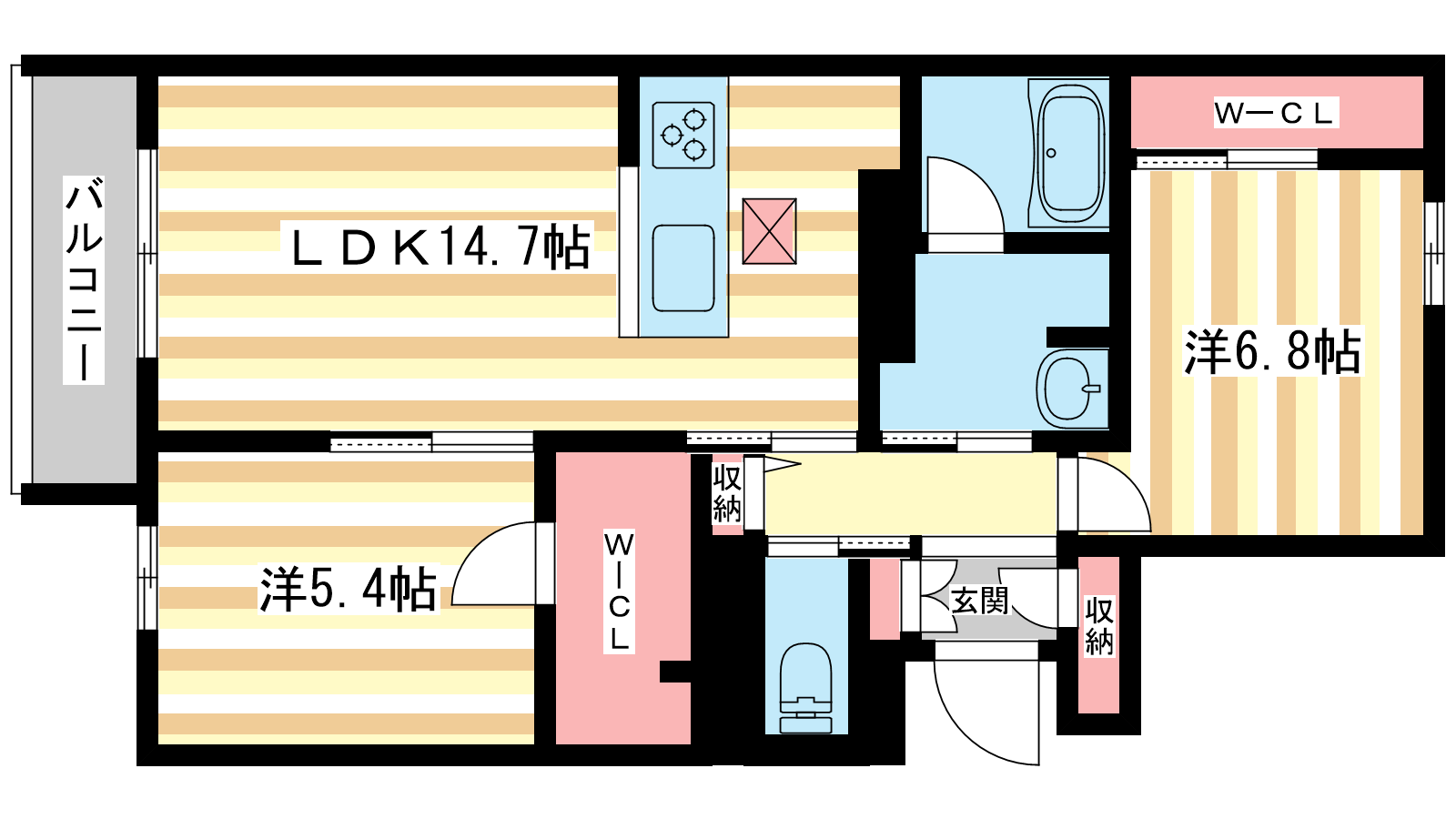 - LDK14.7帖、洋室6.8帖、洋室5.4帖