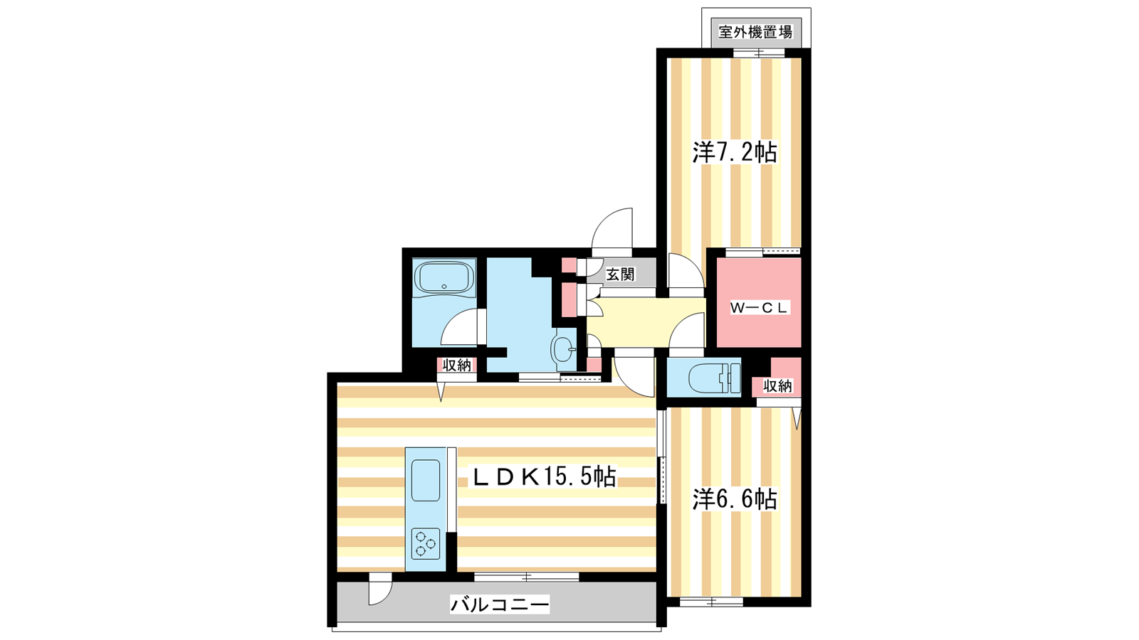 - LDK15.5帖、洋室7.2帖、洋室6.6帖