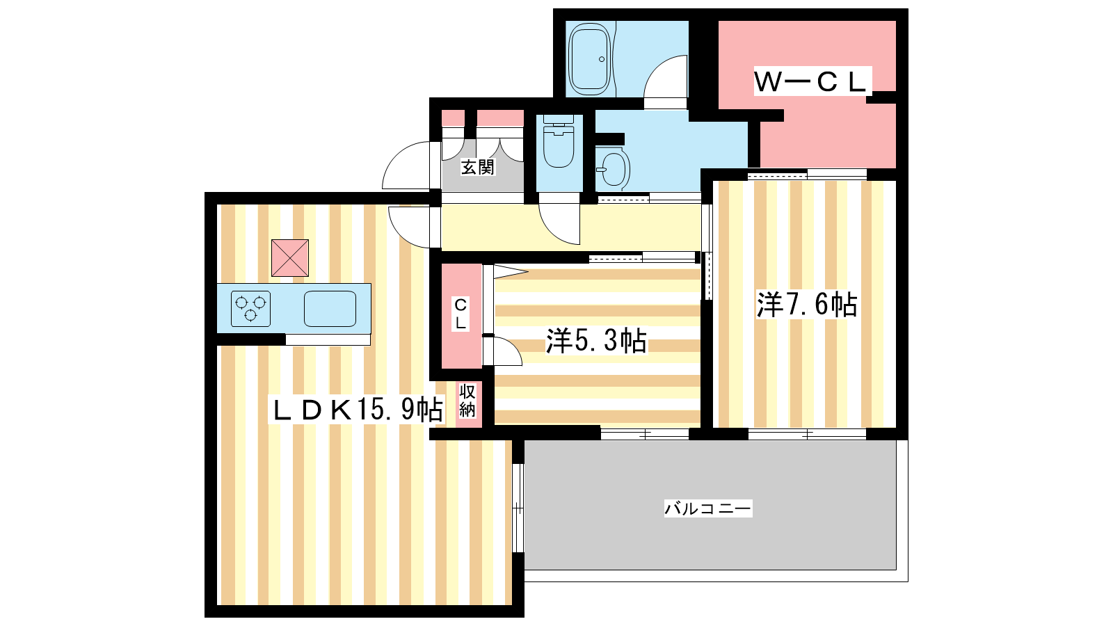 - LDK15.9帖、洋室7.6帖、洋室5.3帖