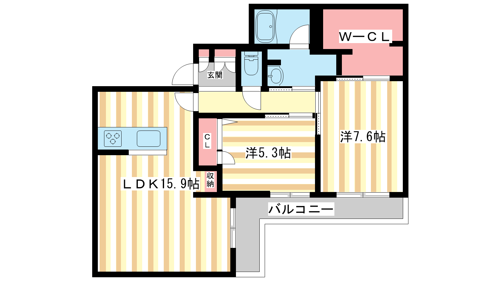 - LDK15.9帖、洋室7.6帖、洋室5.3帖