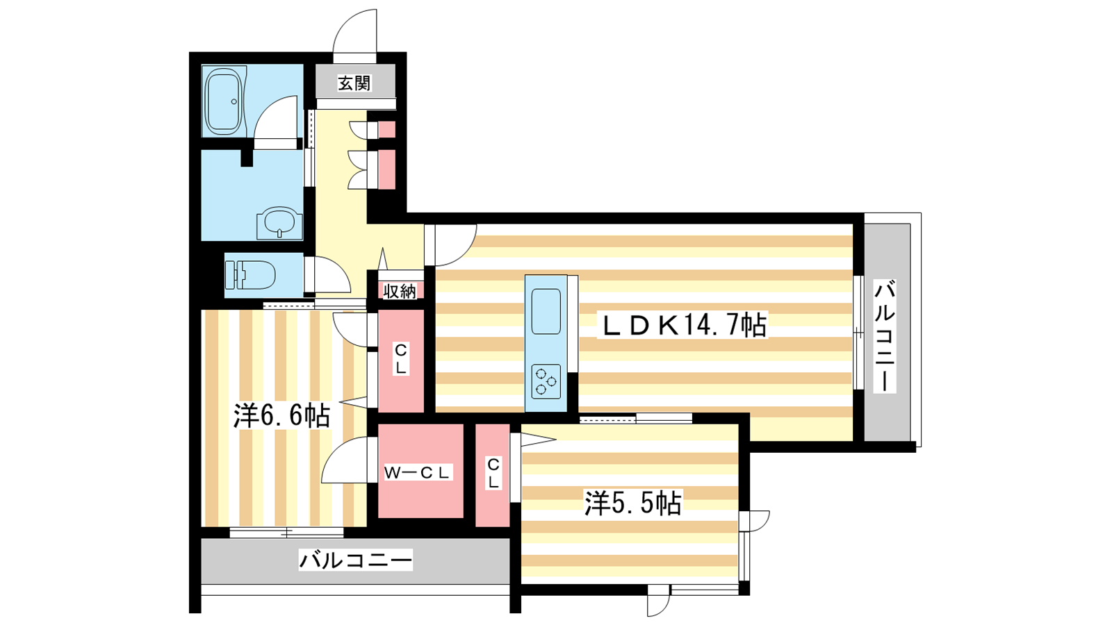 - LDK14.7帖、洋室6.6帖、洋室5.5帖
