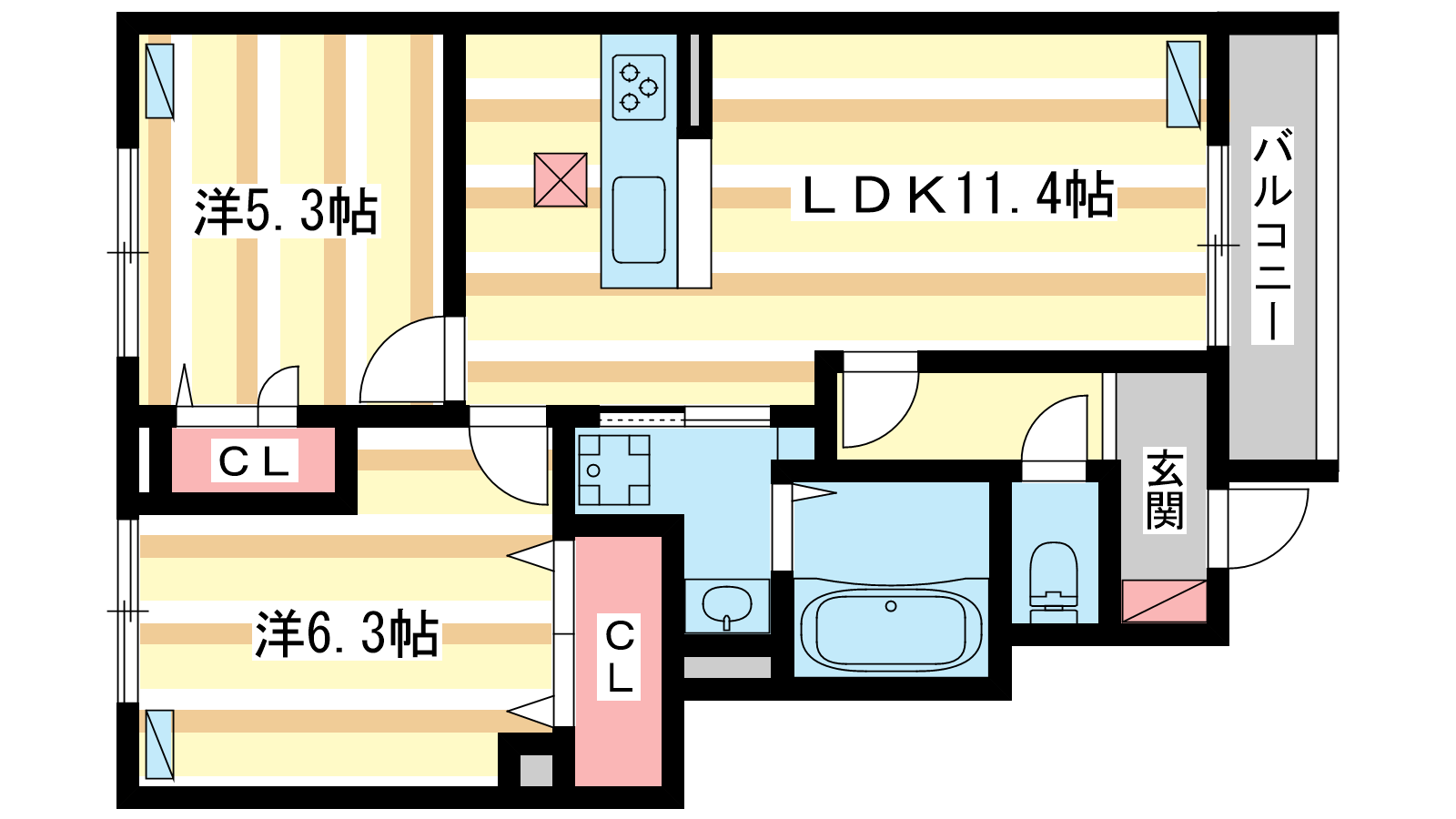 - LDK11.4帖、洋室6.3帖、洋室5.3帖