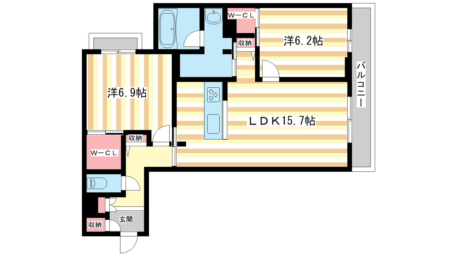 - LDK15.7帖、洋室6.9帖、洋室6.2帖