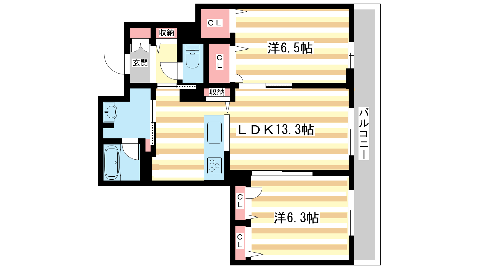 - LDK13.3帖、洋室6.5帖、洋室6.3帖