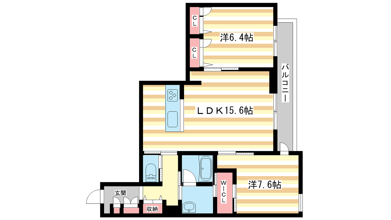 - LDK15.6帖、洋室7.6帖、洋室6.4帖