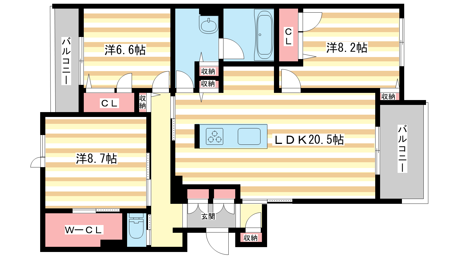 - LDK20.5帖、洋室8.7帖、洋室8.2帖、洋室6.6帖