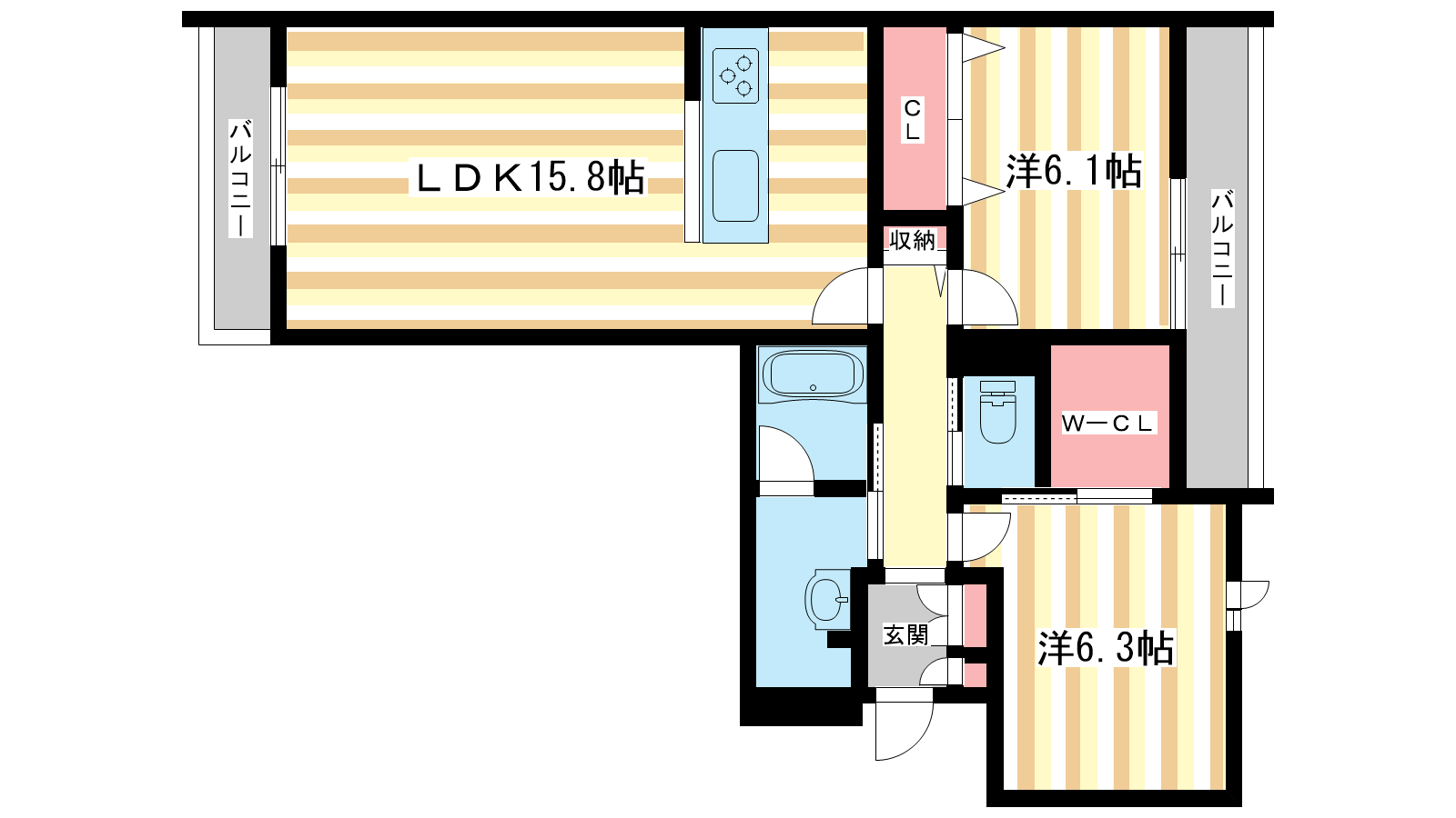 - LDK15.8帖、洋室6.3帖、洋室6.1帖