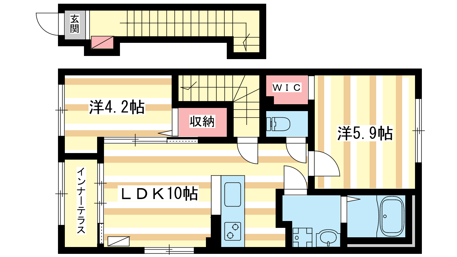- LDK10帖、洋室5.9帖、洋室4.2帖