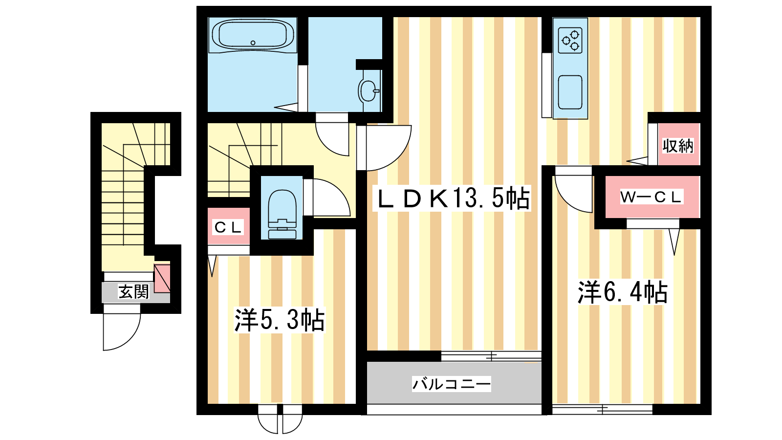 - LDK13.5帖、洋室6.4帖、洋室5.3帖