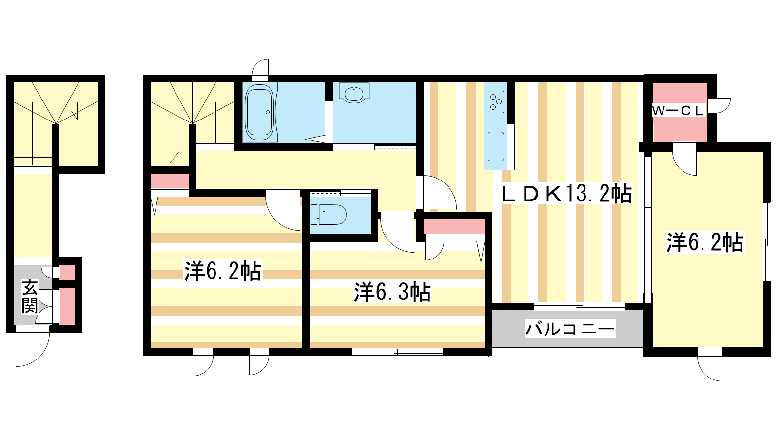 - LDK11.6帖、洋室6.3帖、洋室6.2帖、洋室6.1帖